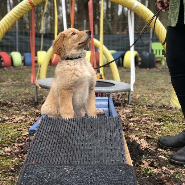 Welpen werden nett eingeladen und Mut zugesprochen, damit sie sich über die Elemente trauen.